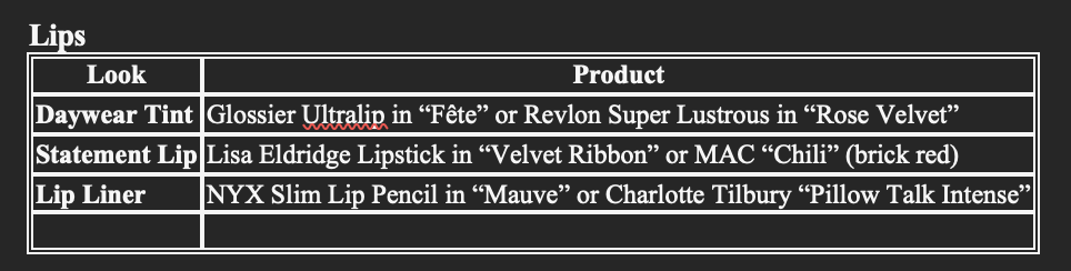 ☐ Apply lip color: soft rose, terracotta, or statement red